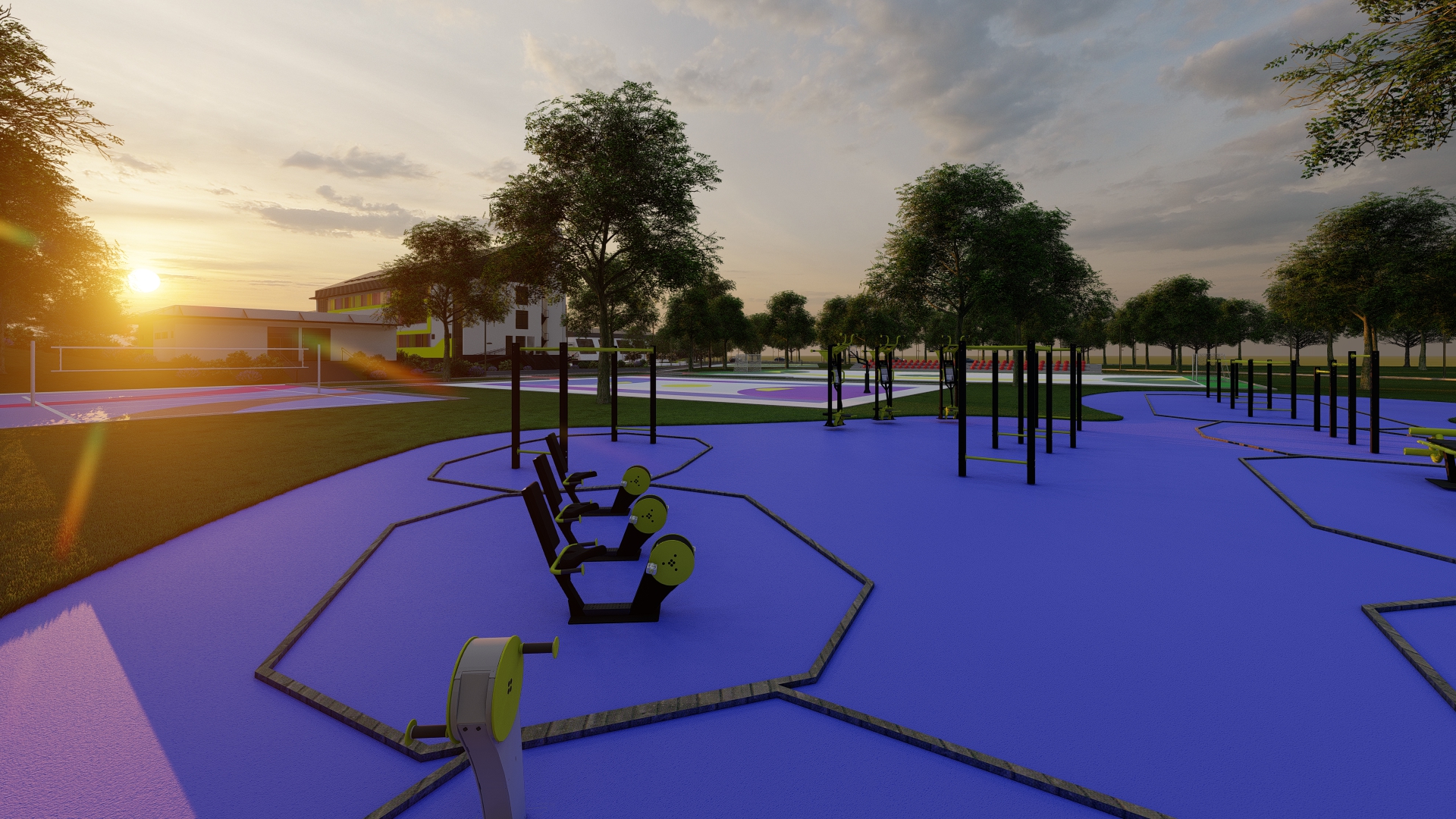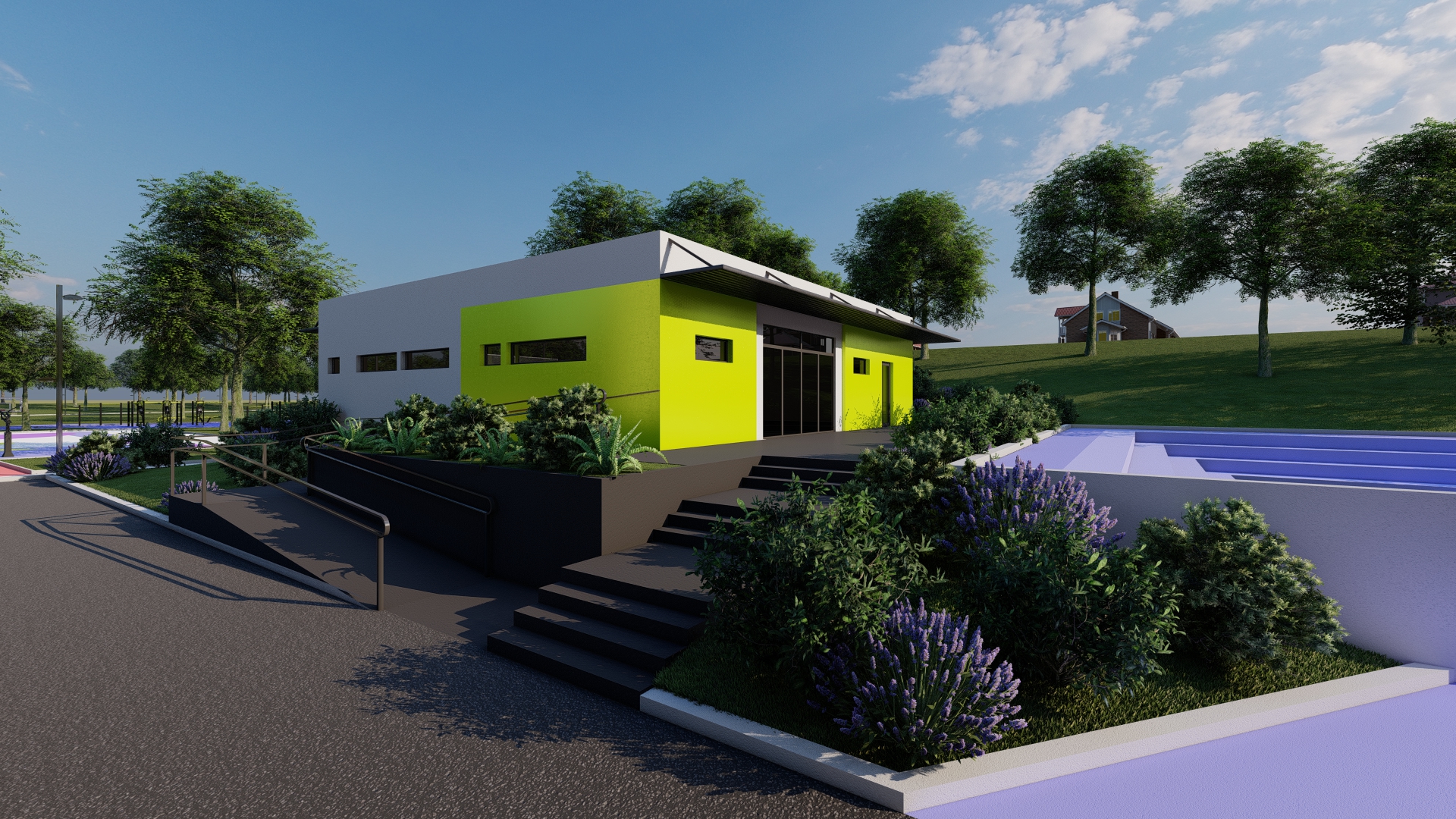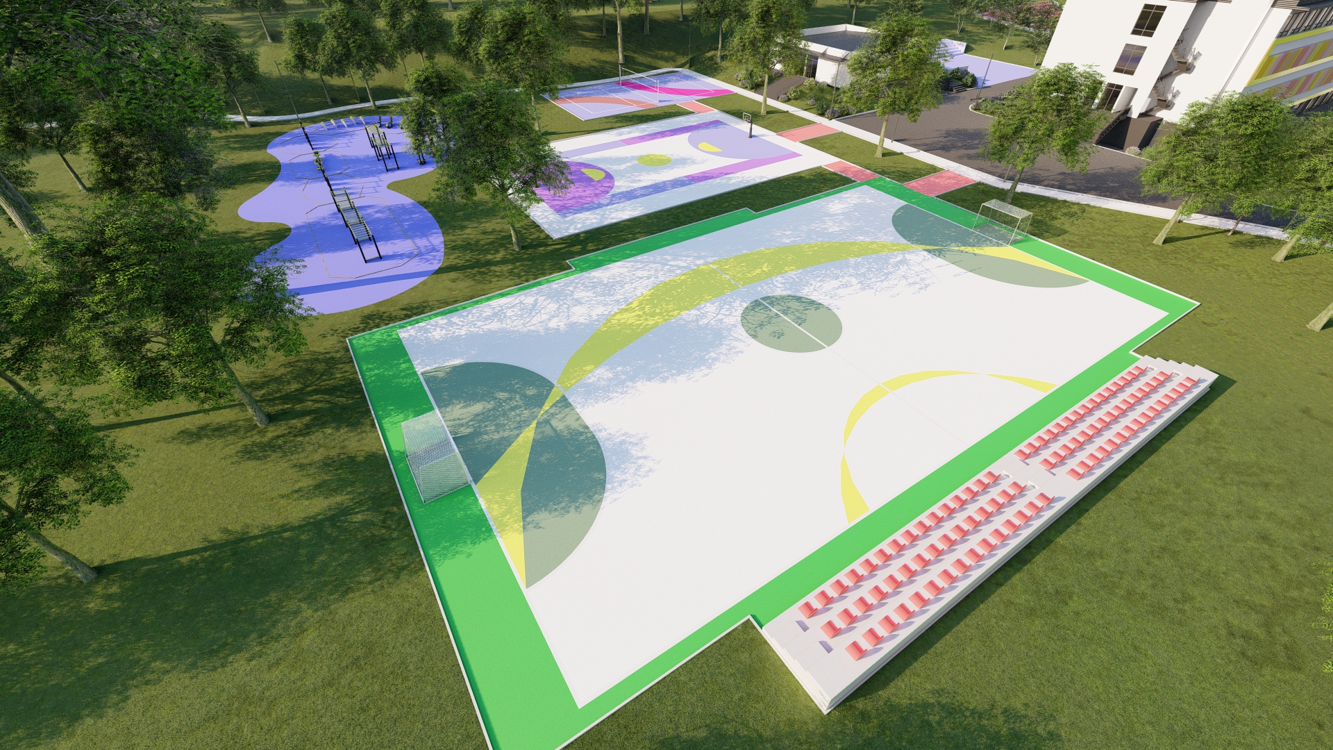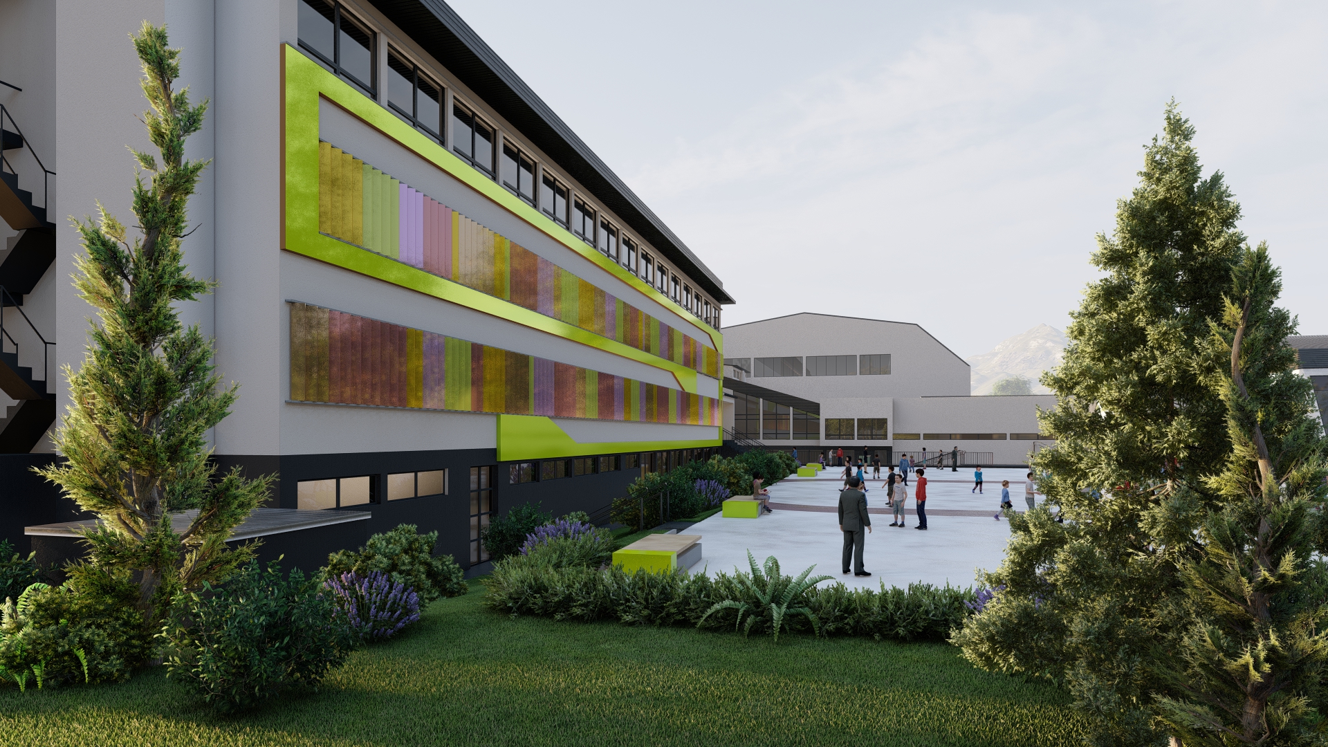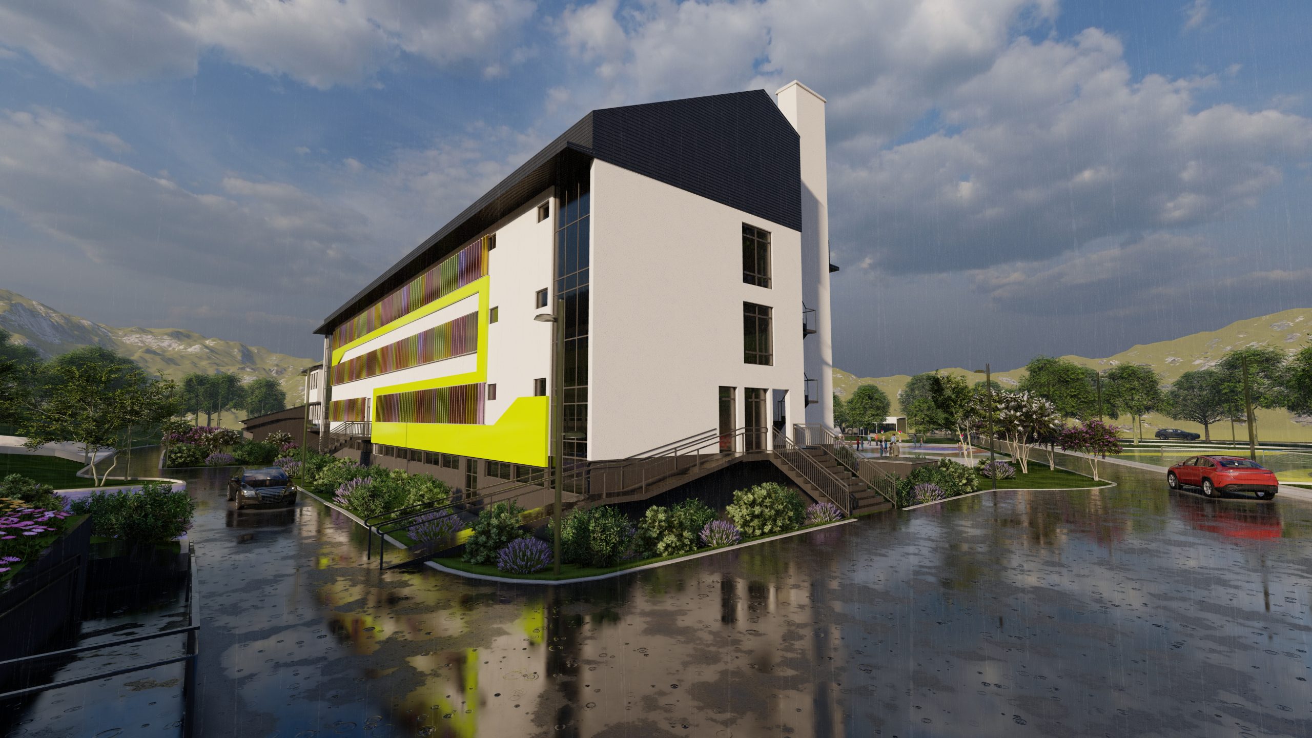 Through architectural design, the building is transformed in such a way as to retain the existing external structure, but to point out its basic function, which is basic education, through the playfulness of individual details. The same principle is applied to the exterior decoration in a two-dimensional form on part of the outdoor sports fields, where free-form artistic expression is applied.
